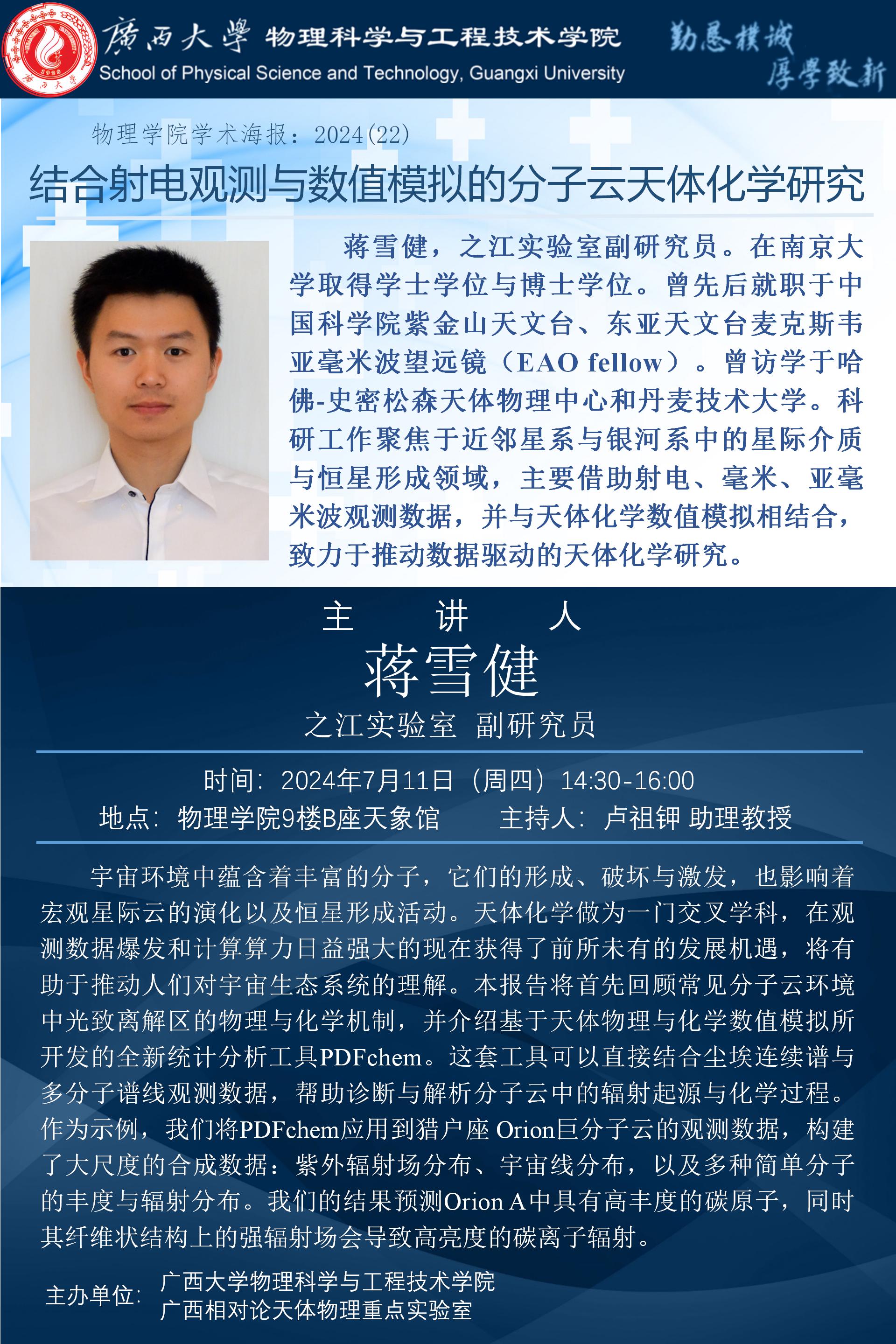 物理学院2024年学术报告之22:结合射电观测与数值模拟的分子云天体化学研究